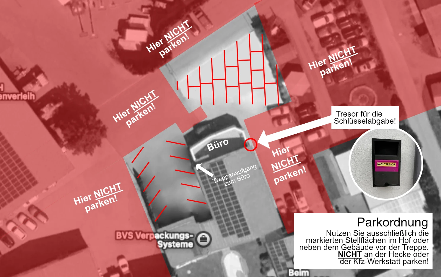 Bevor Sie Ihr Fahrzeug abstellen, achten Sie bitte auf unsere Parkordnung. Nutzen Sie ausschließlich die markierten Stellflächen im Hof oder neben dem Gebäude vor der Treppe. Unser Team hilft Ihnen bei Fragen jederzeit gerne weiter.